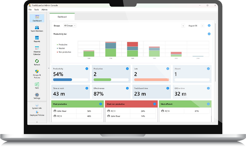 Track employee activities, productivity trends, and system performance through immediate analytics and alerts.